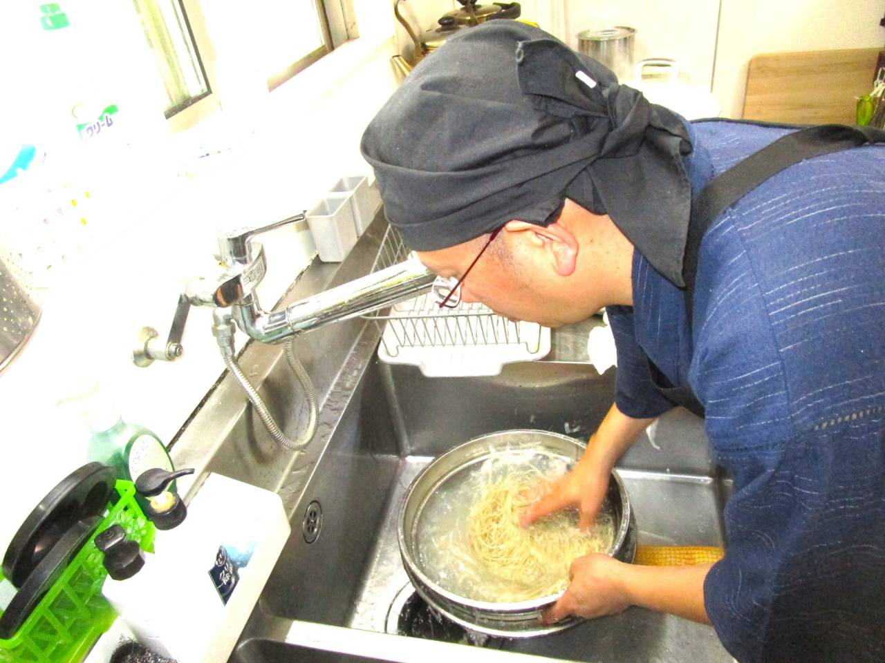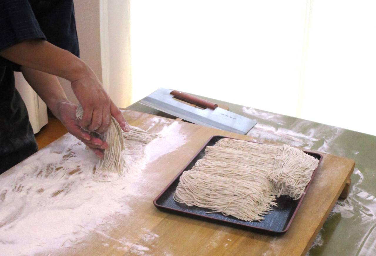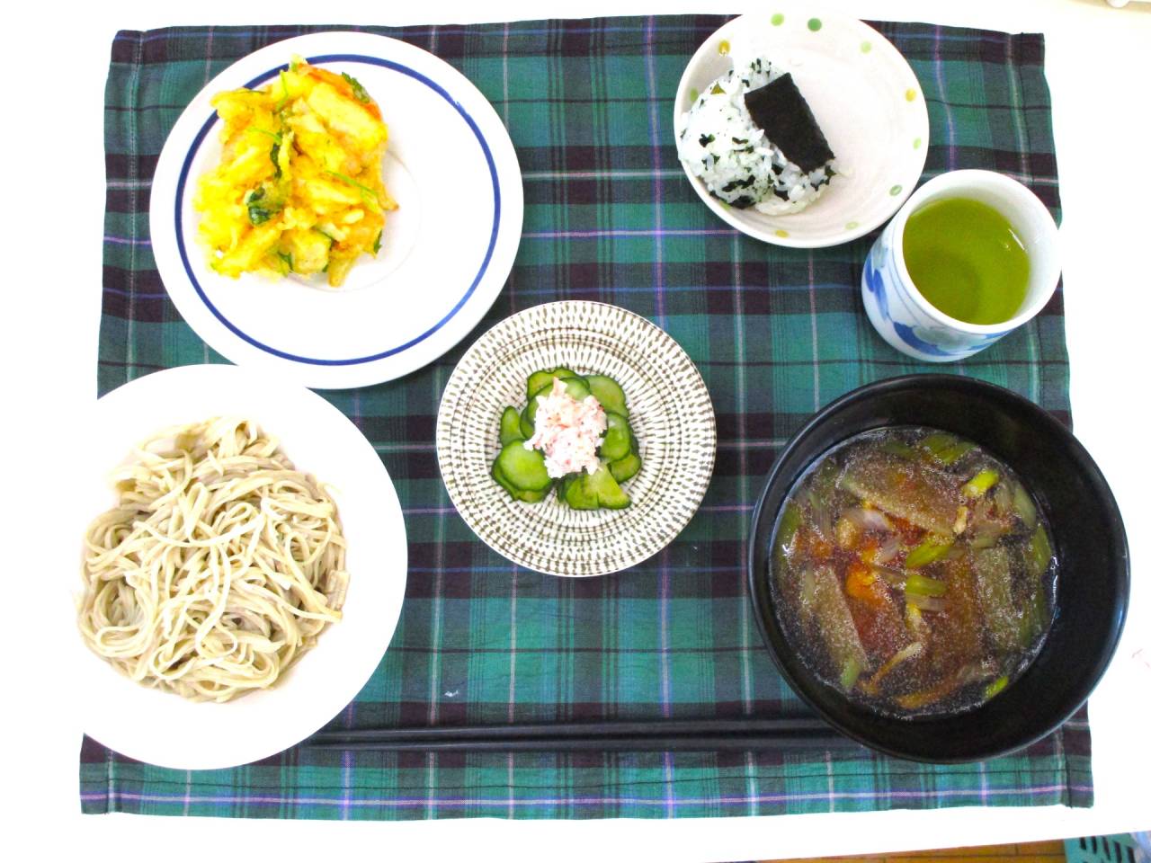 デイサービスちゃのみ【上尾】 2025/06/30 手打ち蕎麦part2 広森庵 ここまで細く切るには何年もの修行が... 切った蕎麦を茹で、冷水でしめて・・・ かき揚げの天ぷらに、つけ汁、わかめおにぎり、キュウリのサラダが付いて♪出来上がり☆ 打ち立てのお蕎麦は格別♪美味しく頂きました☆