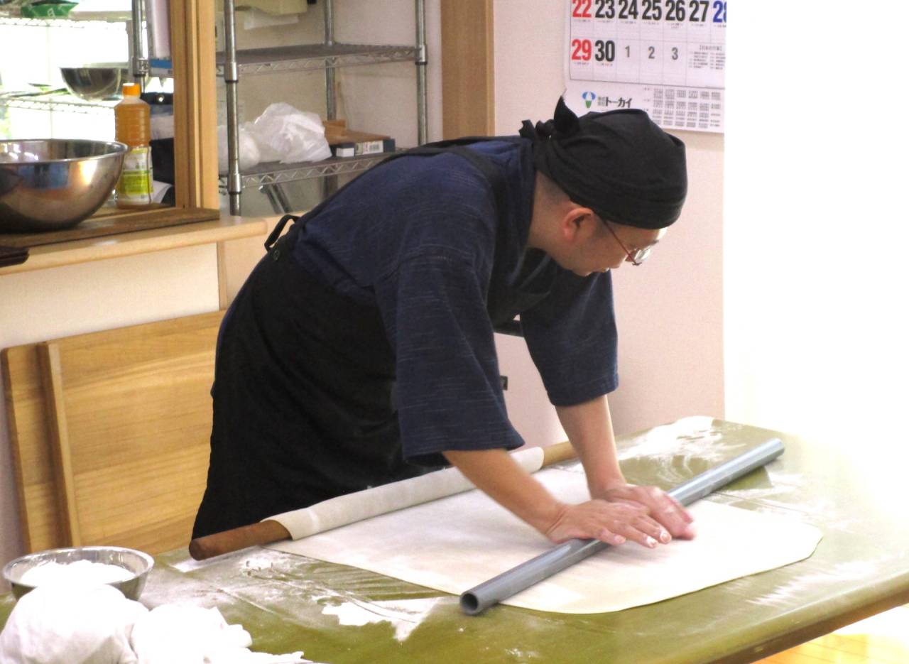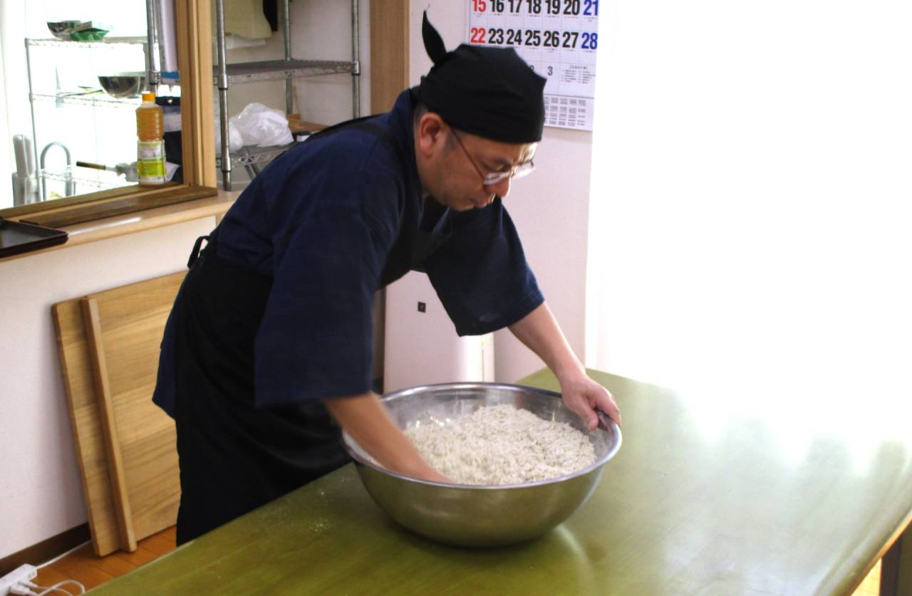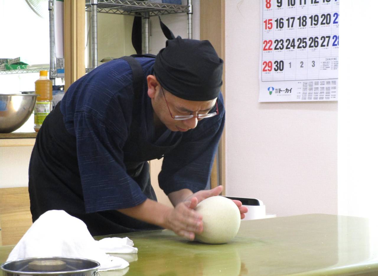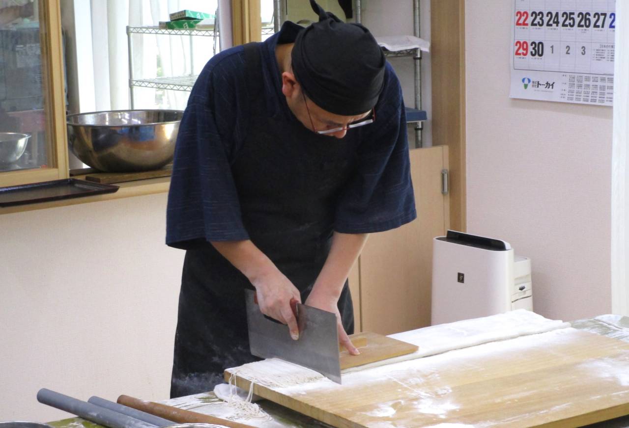 デイサービスちゃのみ【上尾】 2025/06/30 手打ち蕎麦part1 広森庵 6月某日。所沢の蕎麦屋たつみそばで修行をした、ちゃのみの家の料理長が蕎麦打ちに☆まずは蕎麦粉に水を足して・・・ 素早く混ぜ、何回も菊練りして球状に 球状にした物を今度は麺棒でのして、均等に平たく伸ばしていきます 平たく伸ばした物を折って、今度はトントンと小気味良くリズムに乗せて細く切っていきます